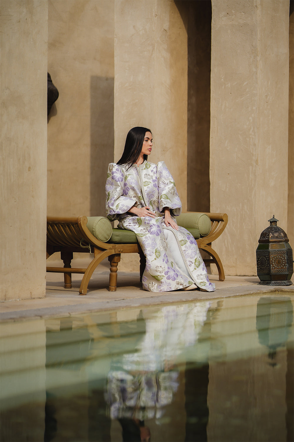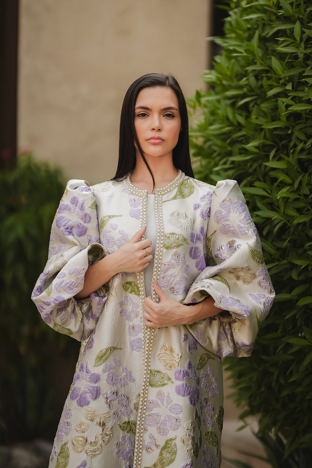 The Purple from our Ramadan 2026 Collection is a refined open abaya–style jacket crafted from subtly luminous polyester fabric woven with gold thread. Designed for fluid layering, it features softly structured shoulders and a flowing silhouette that moves gracefully with the body.